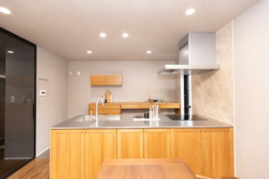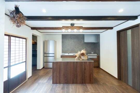 ↑ こちらは古民家のリノベーションでの施工事例。古民家ならではの梁や建具の中にもステンレスの天板がマッチしています!ウォルナット×ステンレス
