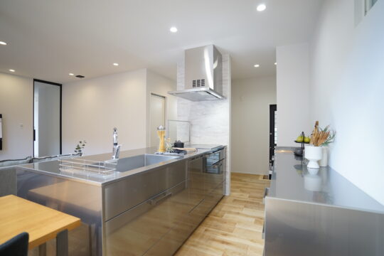 この辺りがステンレス天板のメリットや特徴になります!ではステンレス天板を使ったNext Design Homeの施工事例をご紹介!!
