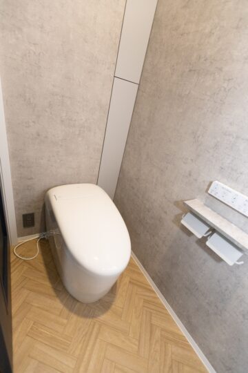 ヘリンボーンの床×ニュアンスカラーの壁紙で洗練された雰囲気に!棚や収納スペースがあるペーパーホルダーには消臭スプレーやディフューザーなどおいたり、スッキリ埋め込み収納の下の棚には掃除道具など生活感のでるものをいれることができます。