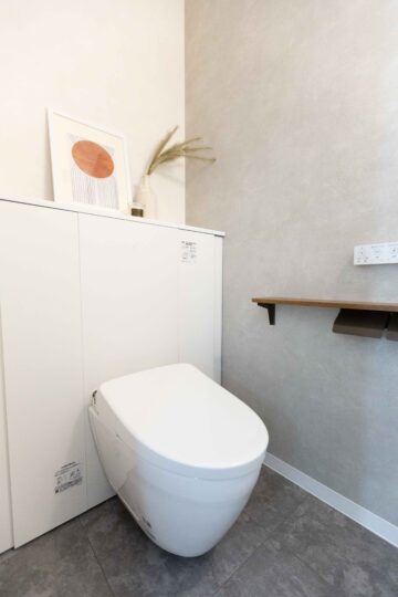 背面に扉付きの造作収納!トイレットペーパーや掃除用品などいれることができて扉をしめればスッキリ!やわらかなニュアンスグレーのトイレ空間にペーパーホルダーもピッタリの雰囲気で!