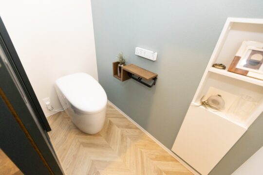 ヘリンボーンの床×ニュアンスカラーの壁紙で洗練された雰囲気に!棚や収納スペースがあるペーパーホルダーには消臭スプレーやディフューザーなどおいたり、スッキリ埋め込み収納の下の棚には掃除道具など生活感のでるものをいれることができます。
