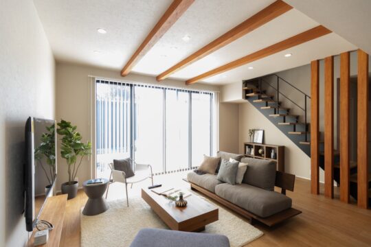 抜け感のあるスケルトン階段がアクセントになり、リビング全体をより広くみせてくれてます。