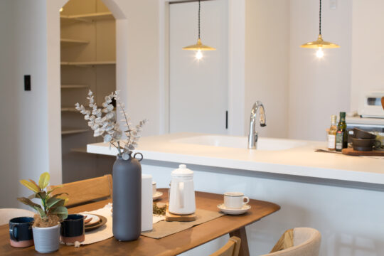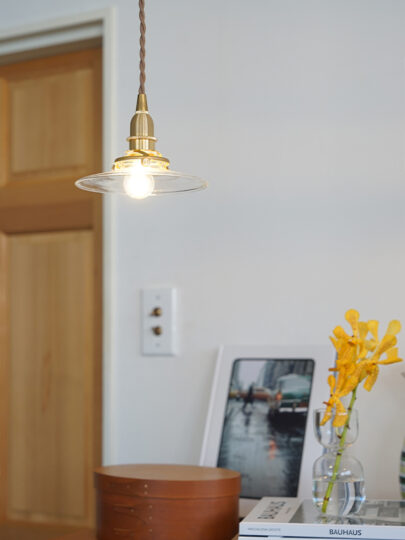 ダイニングテーブルやキッチンにあわせてクリアガラスのペンダントライトをつけると、ガラスシェードの透明感が空間を明るく軽やかにみせてくれます。