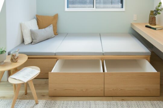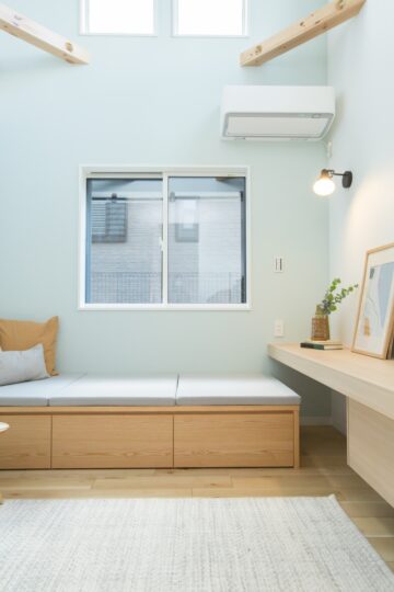 ↑窓際に収納付きの造作ベンチ!たっぷり収納可能です◎明るい窓際でずっといたくなるような心地よい場所になりそうです!