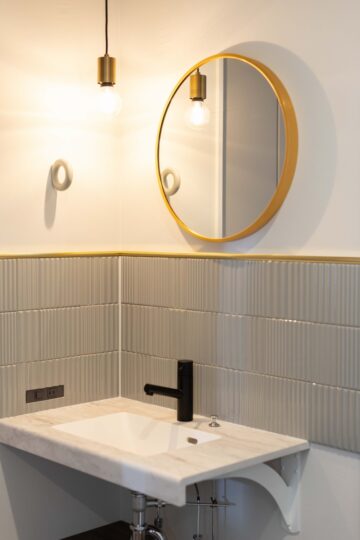 ↑シンプルな洗面に真鍮ミラーをプラスするだけであたたかみのある雰囲気に!