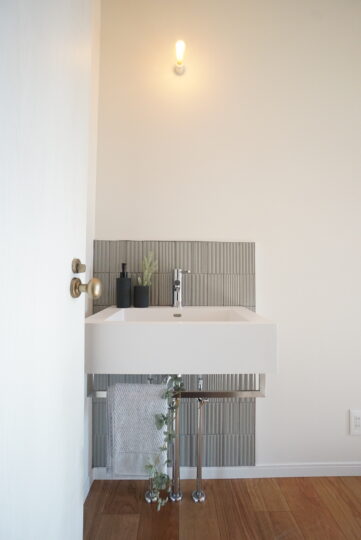 造作収納×タイルにぴったりなミラー!トイレでてすぐ手洗いできる洗面も便利!