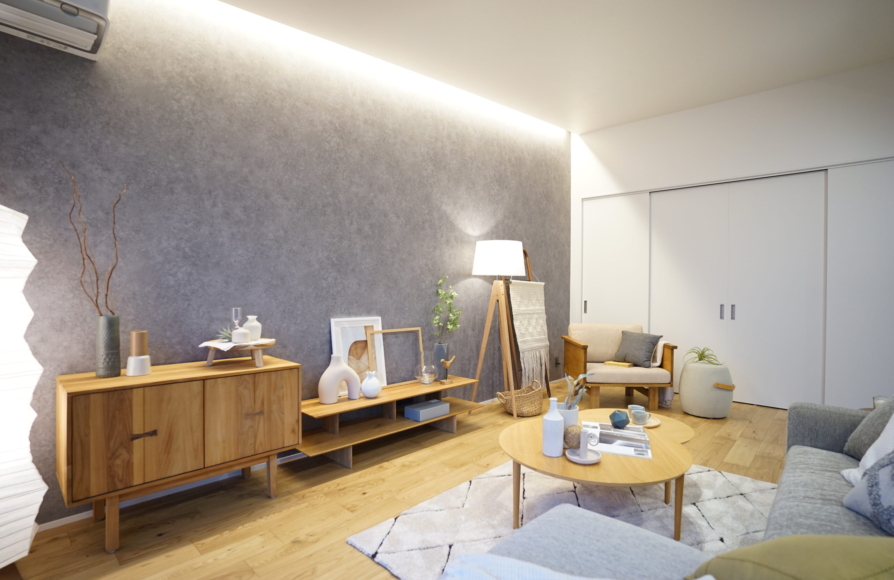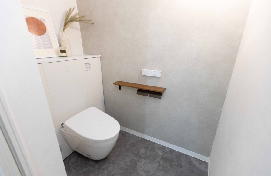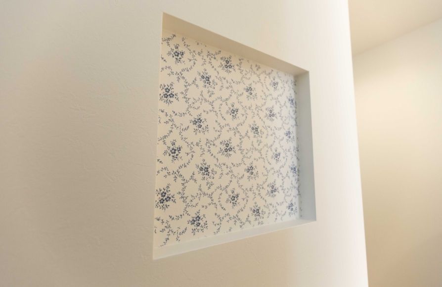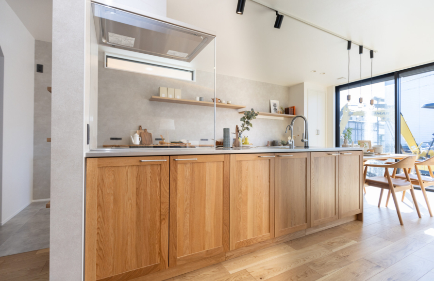 キッチンとダイニングテーブルは横並びの配置にしました。小さなお子様達を見守りながらの家事は本当に大変。少しでも移動距離を短く、食事の準備や後片付けがラクにできる配置です。床のオーク材にあわせてキッチンとカップボードもオークの面材で揃えました。カップボードの背面に選んだ薄いグレーのアクセントクロスと木目の相性がとても良い感じです。 飾り棚もカップボードからスタディースペースまでの長い棚板を採用して、棚受けが見えないスッキリとしたタイプにしました。ダイニングテーブルの後ろにあるスタディースペースは造作でつくりました。箱型にすることで、学校の引出しのようにノートパソコンを収納したり、書きかけのノートを収納したりすることができます。リビングの一角につくるスタディースペースはとても便利ですが、ついつい置きっぱなしにしがちな場所でもあるので、サイドに収納を計画するなどの工夫が大切です。