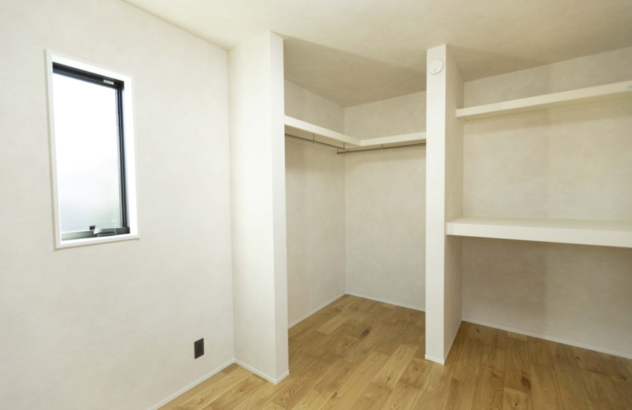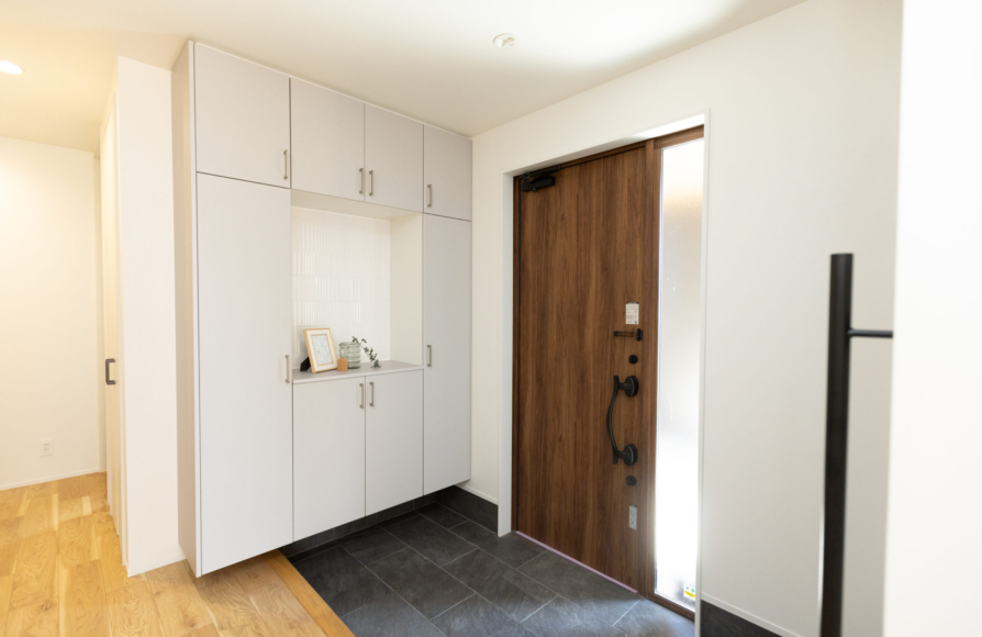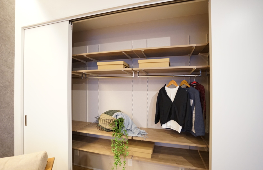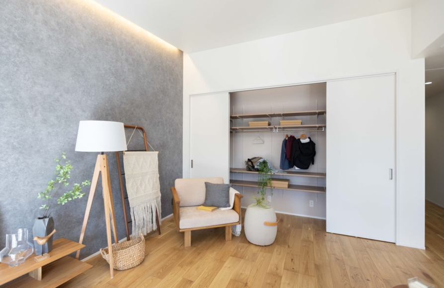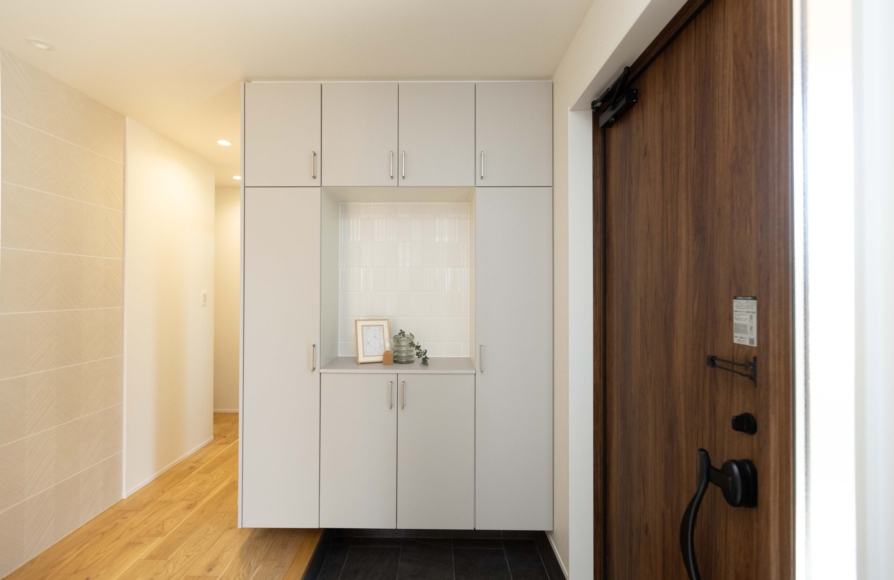 約3帖分のパントリーは可動棚をつかいながら、大容量の収納力になっています。使うものにあわせて棚板の奥行を変えて収納しやすい仕組みにしています。パントリーの中には、普段あまり使わない家電や、冷凍庫も収納するスペースを確保しています。扉の向こうは玄関になっているので、まとめ買いをして帰ってきたときも、玄関からすぐにパントリーに荷物を置けるのがとても便利です。