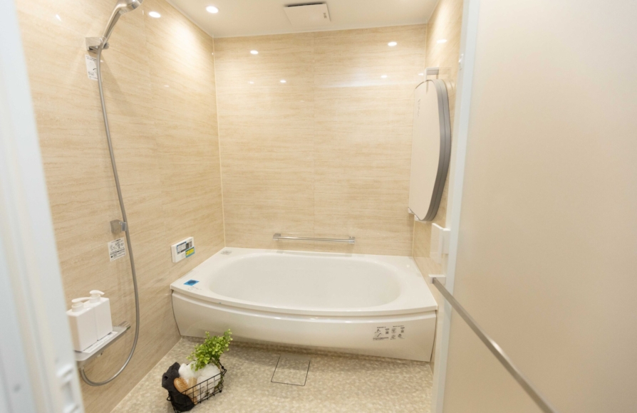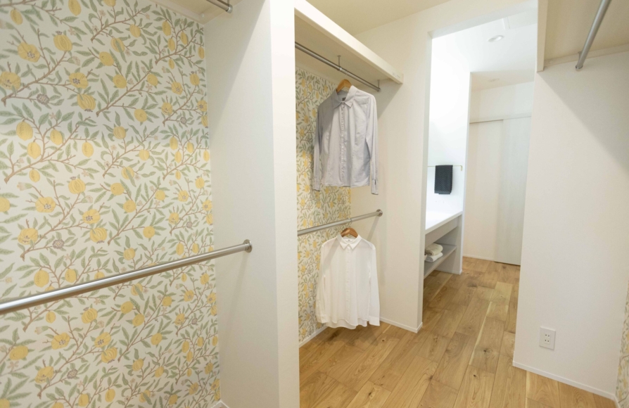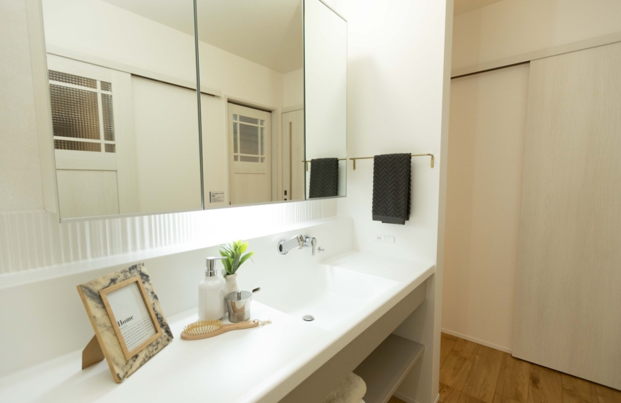 脱衣室や洗面スペースとは別に3帖のランドリースペースを確保しました。汚れがひどいときは多目的シンクでつけ置き洗いをして、隣の洗濯機にすぐに入れることができます。花粉の時期や梅雨の時期でも、天候に左右されず自由な時間に洗濯ができるランドリースペースは家事がはかどる1つの空間です。洗濯機から出してすぐに干せて、つくりつけた棚板の上でアイロンをしたり畳んだりすることができます。毎日やらないといけないことなので、いかに時短できるかを考えてランドリースペースを提案しています。
