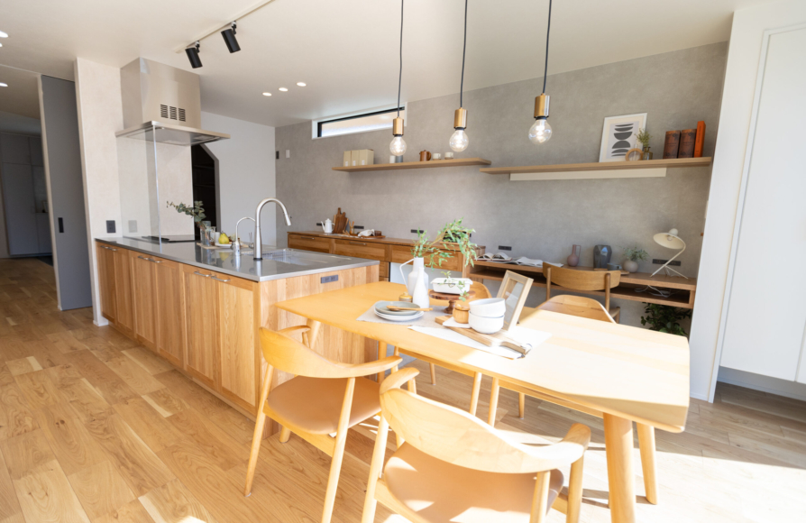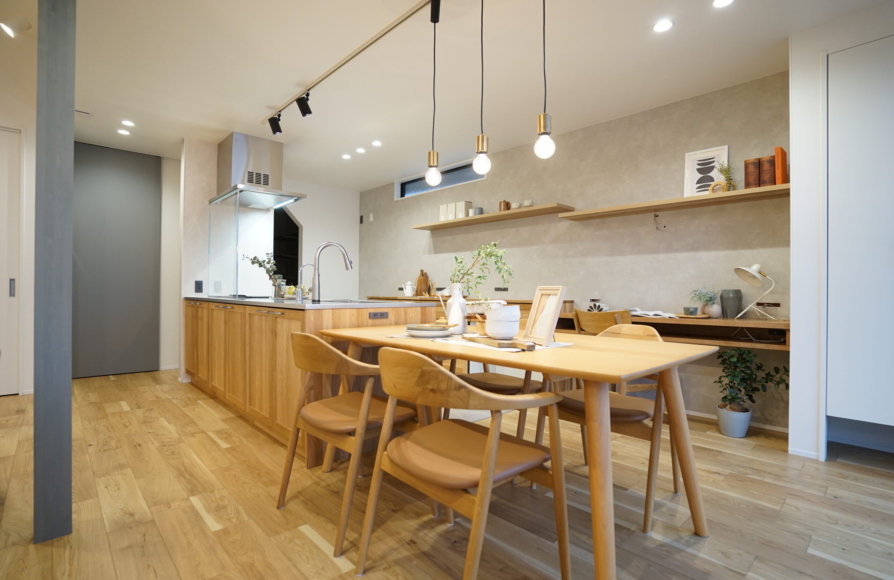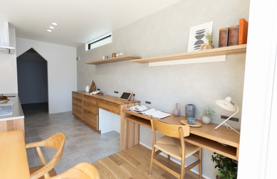 段違い飾り棚とスタディースペースが映えるダイニングキッチン