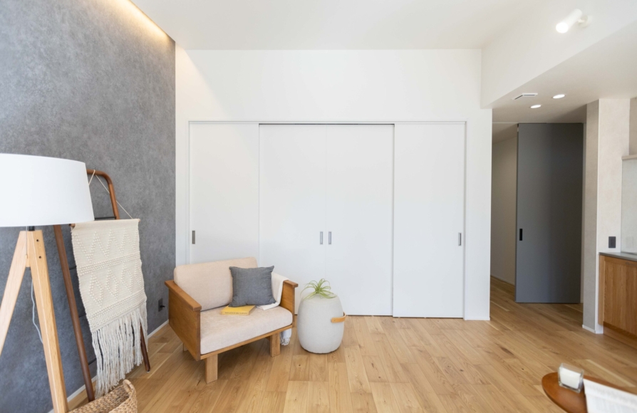 リビングの一角の白い扉の中に家族ロッカーをつくりました。4人家族なので1人1つずつスペースがあります。帰宅した時に、アウター類やカバン・時計などの小物をさっと収納できるのが便利です。ついついダイニングの椅子やリビングのソファーに置きっぱなしにしがちなモノをラクに収納することができます。 帰宅時の動線上に、リビングダイニングに出しっぱなしになりがちな収納の定位置をつくってあげると、ラクにスッキリリビングを保つことができます。