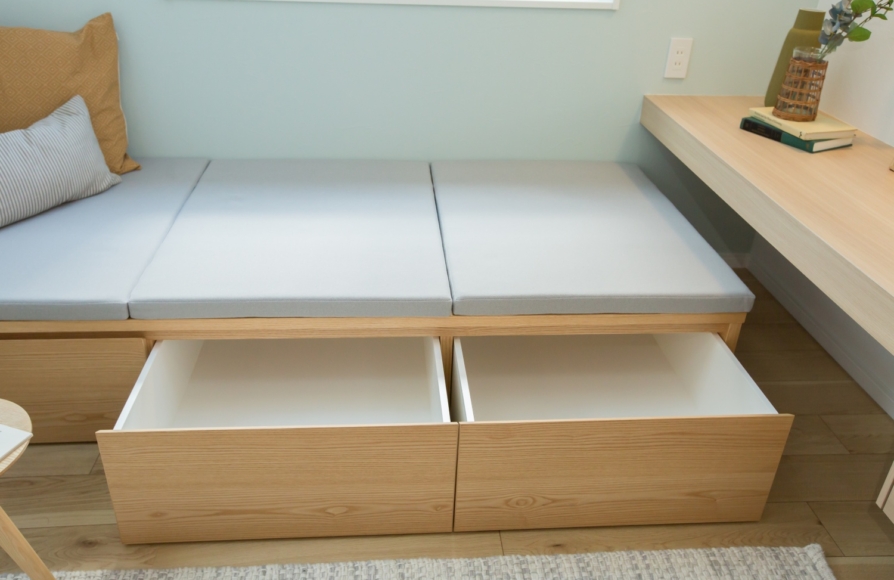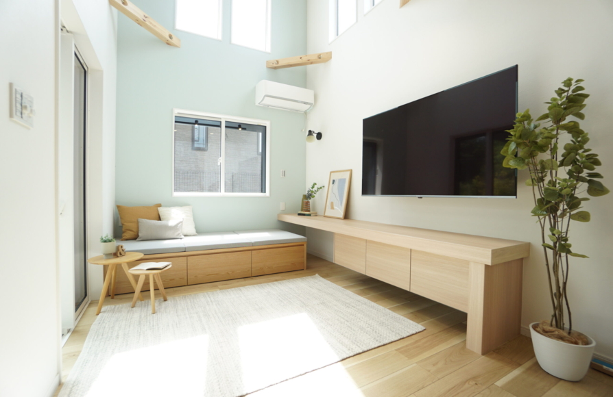 窓の性能にしっかりこだわり、日差しが入るところに窓を設置すれば窓際でも寒くなく、とっても心地よい居場所になります。そんな心地よい場所に収納付きの造作ベンチをつくりました。収納はお子様のおむつや着替え、おもちゃなどよく使うものをスッキリ収納するのにとっても便利。クッションを季節にあわせて変えることでインテリアを更に楽しむことができます。造作ベンチに座って、テレビボードの一部をカウンターとして使うこともできます!
