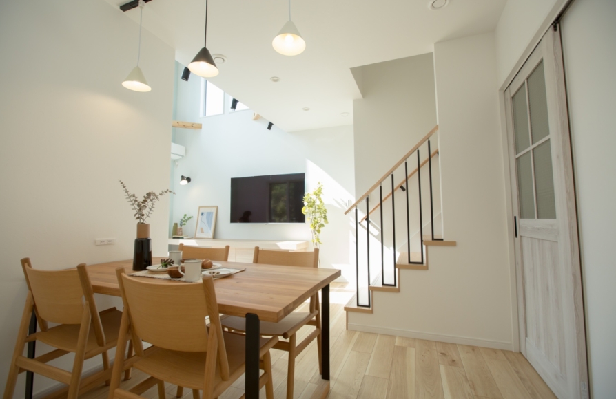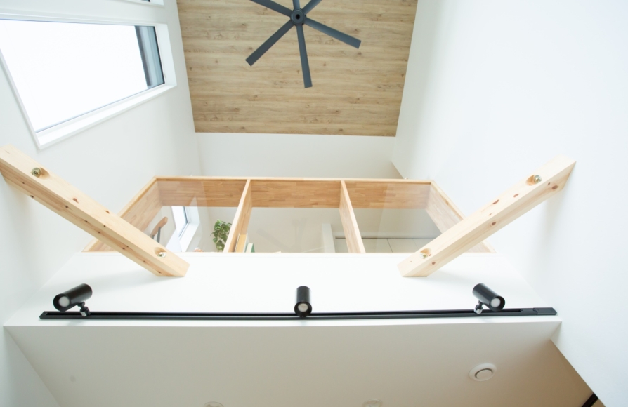 断熱性能をきちんと考えられたお家は上下の温度差が少ないので、吹抜けをつくることでより快適な空間にすることができます。冬は、隣家や周囲からの視線を気にすることなく太陽の日差しをたっぷり取り込むことができます!夏は外付けブラインドを使って、窓の外側でしっかり日除け対策をしています!木目調クロスとブルーグレーのアクセントクロスの組み合わせがとっても素敵な吹抜け空間です。
