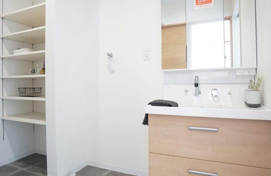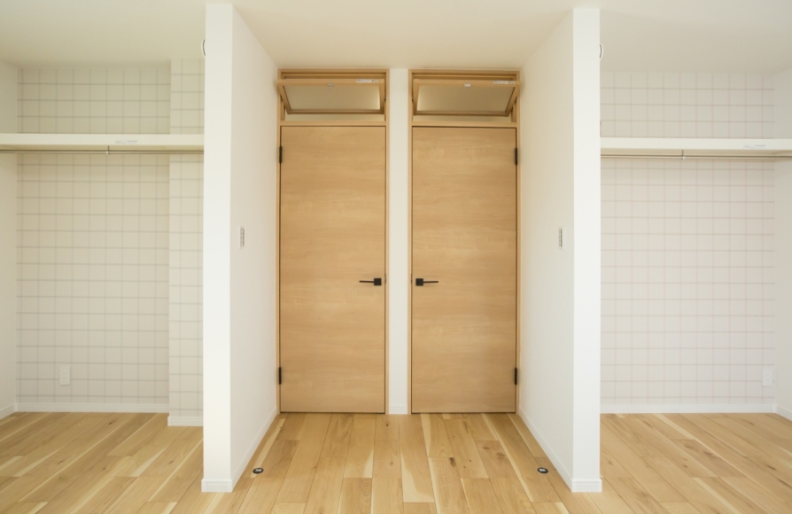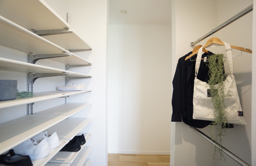 南向きに大きな窓を設置したサンルーム。完全に室内干しができる空間にしました!洗濯機のある脱衣室からも一直線。普段ご家族が着る服はすべてここに収納。お子様も自分でとれるように、ハンガーパイプの高さを調整できるようにしています。