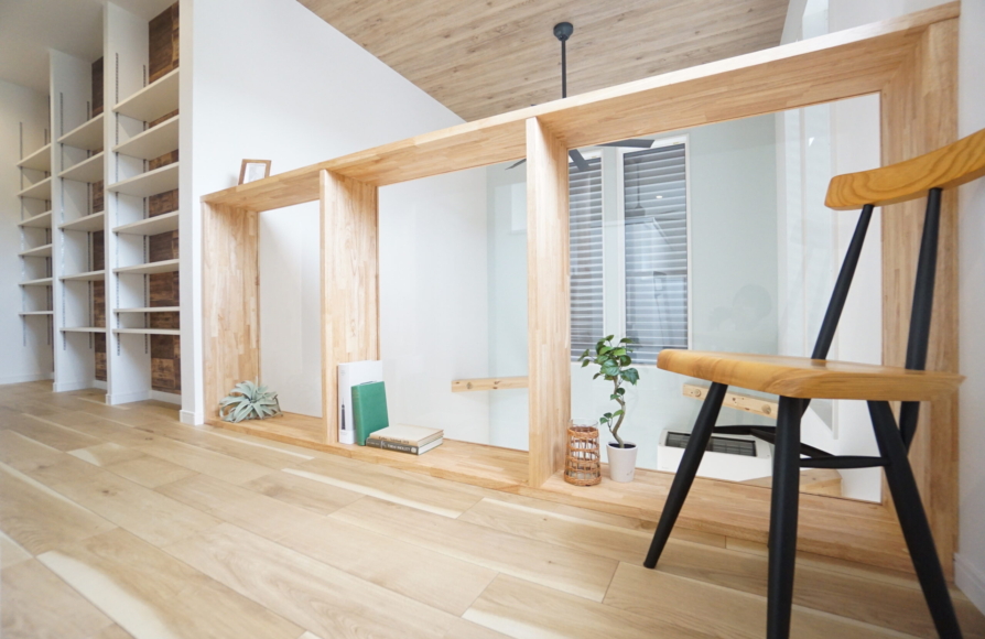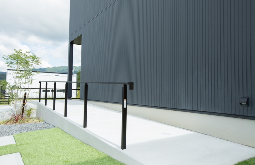 玄関はスロープと階段どちらからもアクセスできるアプローチにしました。枕木や人工芝・砂利を上手く組み合わせて、きれいを保ちやすいお手入れのラクな外構計画にしました。ゲームや漫画など趣味の時間を満喫できるように、2階のホールを少し広めにとって造作の本棚を設置しました。後日点検でお伺いしてみると、約2000冊の漫画が綺麗におさめられていました。テレビやゲームを楽しめるように、65インチのテレビを壁掛けに。見やすい高さや位置にもこだわり、配線計画も壁の中を通すことで配線ゴチャゴチャストレスもありません。趣味の時間を満喫しながらお子様やワンちゃんと楽しく暮らせるお家になりました!