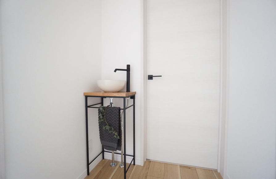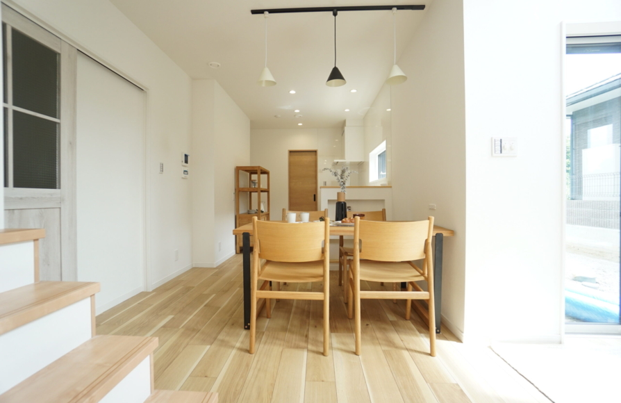 階段下の空間をアーチ型にしてわんちゃんの居場所にしました。壁はクロスではなくパネルを貼って、床の素材もお手入れのしやすいフロアタイルに。ペットシーツやわんちゃんのご飯を収納しておける棚も設置しています。中庭でわんちゃんとお子様が走り回っている姿がとても可愛かったです♪