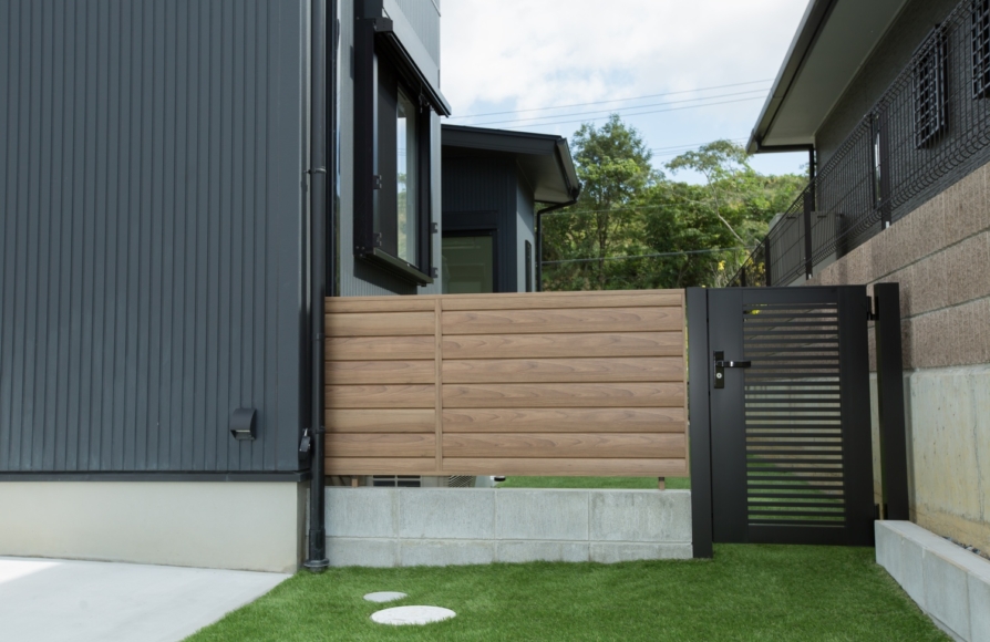 中庭のスペースは人工芝にしました。点検にお伺いしたときもわんちゃんが中庭で走り回っていました。フェンスの隙間からのぞいてくれる姿がとっても可愛いんです。 小さいお子様を遊ばせるときも道路に出るまでに仕切りやドアがあると、飛び出しの心配もなくて良いですね。