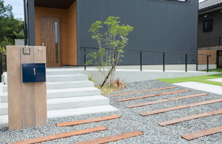 Next Design Homeでの外構提案は後々のメンテナンスを考えて、土のまま残すケースは少ないです。忙しい毎日の中で、貴重なお休みを草むしりに追われてほしくないから。手入れがいき届かなくなってせっかくのお庭時間を楽しめなくなってほしくないから。そんな思いを込めて外構計画をしています。アプローチ部分も防草シートをひいた上にブラックの砂利を敷き詰めています。砂利のみだと少し無機質な感じになるので 枕木を組み合わせると、とっても良い感じです。枕木は真っ直ぐ並べるのも、ランダムに並べるのも良いですね♫