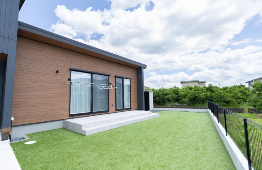 90坪の敷地を活かしたゆったりとしたお庭計画です。休日にお友達が集まることも多いので、バーベキューをしたりプール遊びをしたり、子供達が伸び伸びと遊びまわれるお庭になりました。 タイルテラスの奥行は約1.8メートル。一段ステップをつくったので、テラスの上り下りがラクになって、みんなが集まった時も腰をかけることができて便利です。