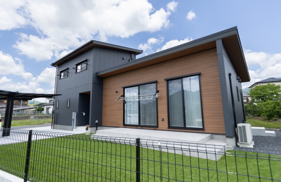 パッシブデザインにこだわって南側の大きな窓がしっかりと真南の太陽の正面にくるように建物を配置しました。「ほぼ平屋」ということで、1階のボリュームが大きく、2階が子供部屋のみの間取りになっています。