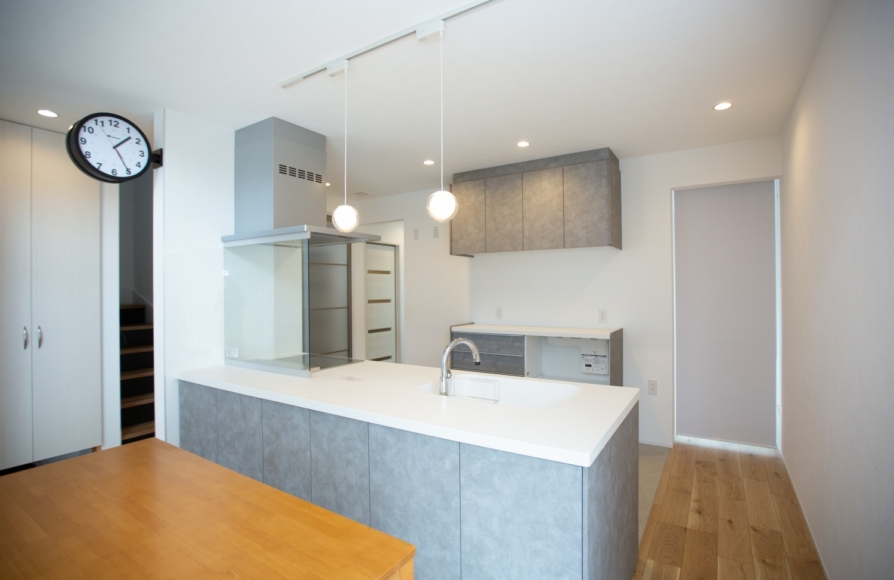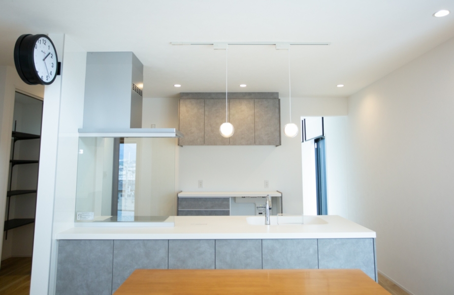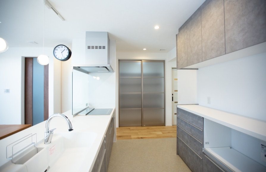 高台にある敷地で西側に見える景観がとてもきれいな場所でした。最初に土地の下見に行かせて頂いた時から、西日の影響は抑えながらも景観を取り込む工夫をしたいと考えたお家です。2階建てですが、1階にLDK+和室+水廻り+サンルーム+ファミリークローゼットがあるので、将来的には1階だけで生活が完結する間取りになっています。