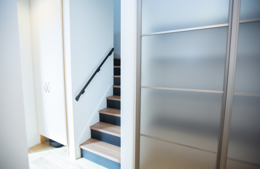 南側に建っているお家の目線を気にすることなく冬の日射を取り入れるため、吹抜けに大きな窓を設置しています。敷地が広い分、建物を土地のどこに配置するか綿密に検討を重ね、隣家の窓・日照シミュレーションなどを繰り替えしながら建物の配置を決めていきました。