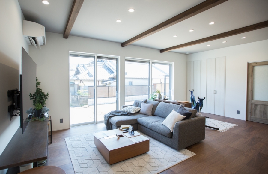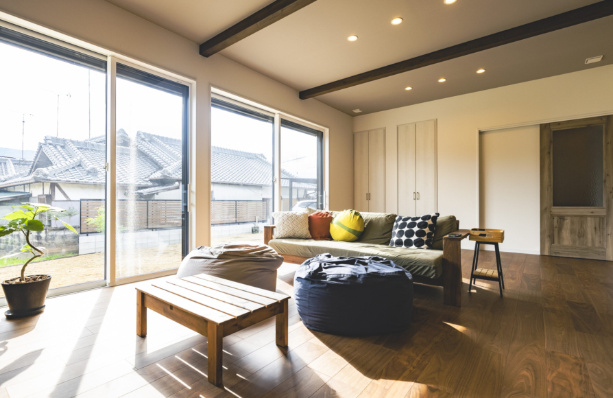 大きな窓からたくさんの陽が入るリビングは、たくさん人が集まれるように26帖の広々空間に設計しました。大きなソファーを置いてもまだ余白のあるスペースでは、ヨガマットをひいてヨガを楽しんだり、卓球台を置いたり暮らしを楽しむスペースになっています。天井の高さを少し高くして天井の梁をあえて見せているので帖数以上の広さを感じることができます。休日の晴れた日には太陽をストーブとして、窓際でお昼寝したり読書をしたり庭の畑を眺めたり…。とっても心地良い暮らしができそうです。