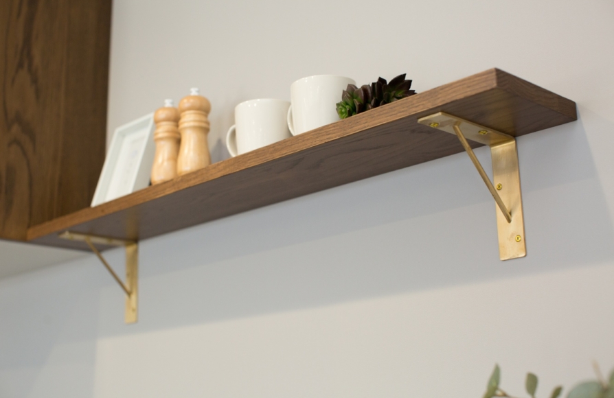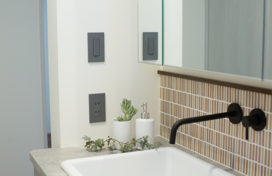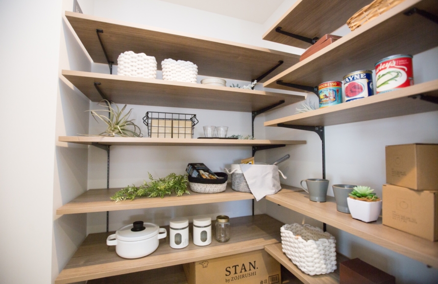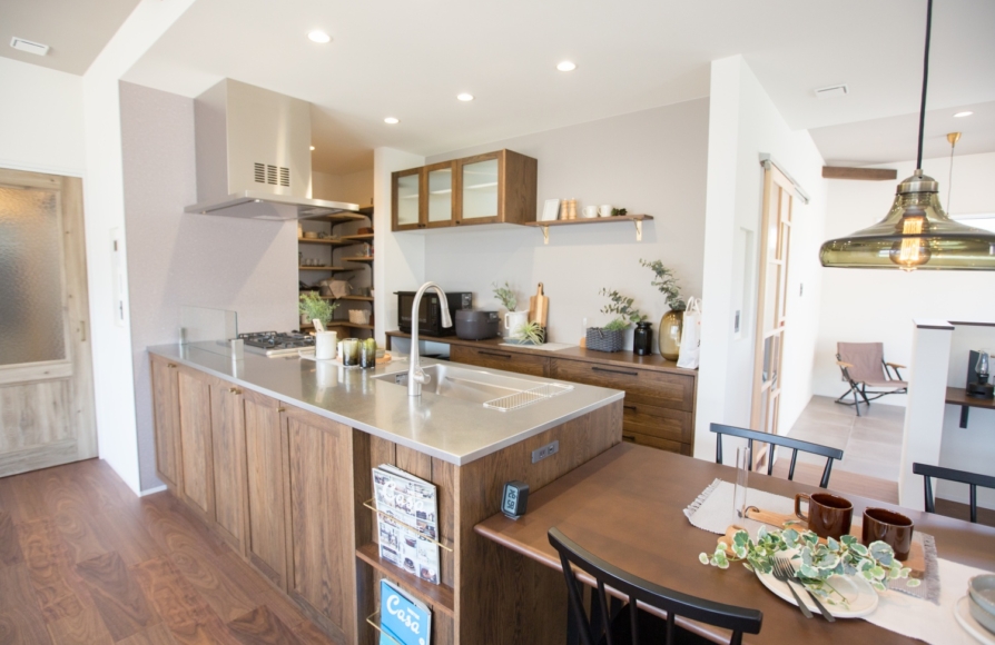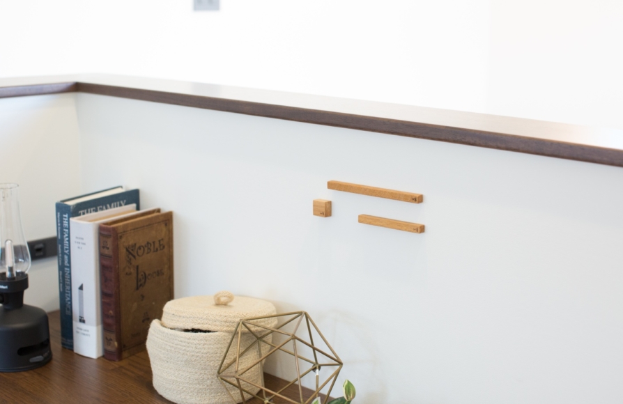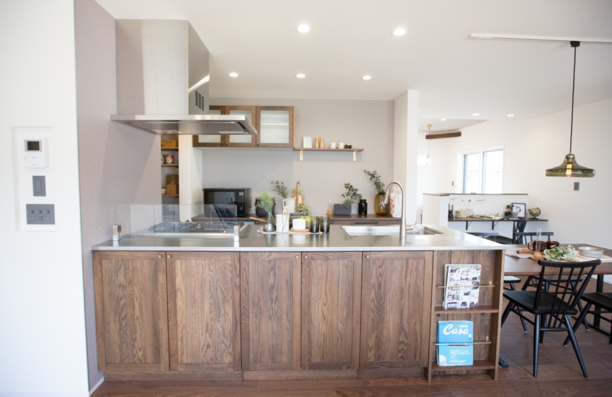 料理上手な奥様が特にこだわったキッチンは、木とステンレスの組合せが絶妙なウッドワンのキッチンを採用しました。キッチンを中心に人が集まってくるように、LDKの中心に配置しみんながまわりで作業やお手伝いができるペニンシュラタイプのキッチンを採用しました。キッチンの背面収納は一部造作にしてレシピ本などを収納。来客やゲストの方とさらに盛り上がれるような一工夫です。キッチンとダイニングテーブルは横並びに配置し、毎日のお料理の配膳や後片付けがラクになる間取りです。カップボードは収納力とインテリアを両立させるため、一部を飾り棚にして可愛いインテリア雑貨を見せる収納にしています。あえて右端をあけているのは、枝モノのグリーンなどを飾れるようにイメージして計画しました。飾り棚の棚受けや把手なども真鍮にするなど、キッチンスペースには小さなこだわりがたくさん詰まっています。