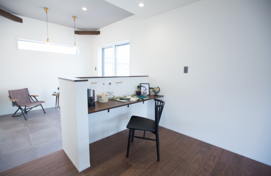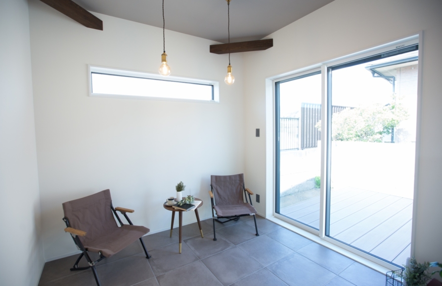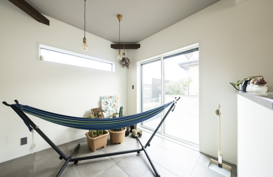 LDKの一角にタイル貼りのインナーテラスをつくりました。多肉やグリーンがお好きなお施主様。グリーンに囲まれた空間でハンモックにゆられてゆっくりできるスペースです。毎日お仕事でお忙しいご夫婦だからこそ家の中での癒し時間を大切に考えました。LDKとは、腰までの高さの壁で仕切ることで、空間を分けながらも家族の存在は感じられる居場所として設計しています。