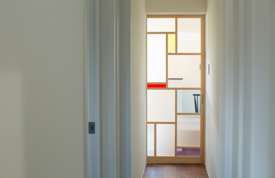 インナーテラスから廊下に繋がる扉は、造作の建具にしています。お打合せの時に、お施主様と佐久間夫婦で好きなカラーを1つずつ選びデザインしていったのがとても楽しい思い出です。ガラスではなくアクリルパネルにして安全面にも配慮しています。平屋の廊下は暗くなりがちですが、この造作建具のおかげで廊下も東側からの明るさを導いてくれる役割も果たしています。