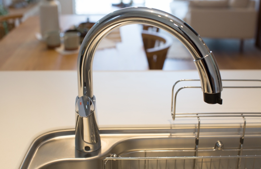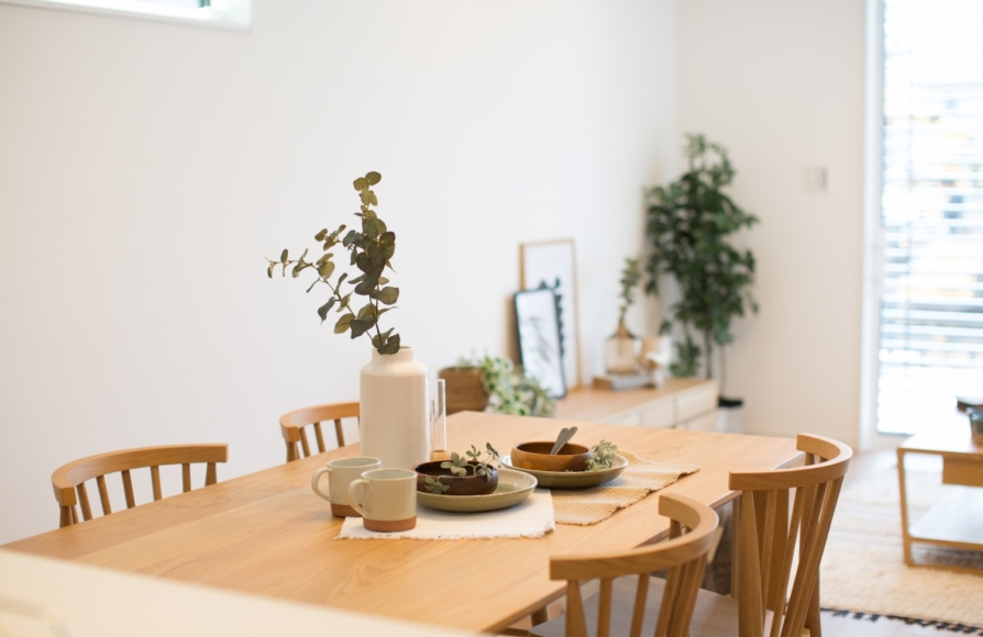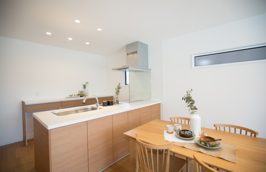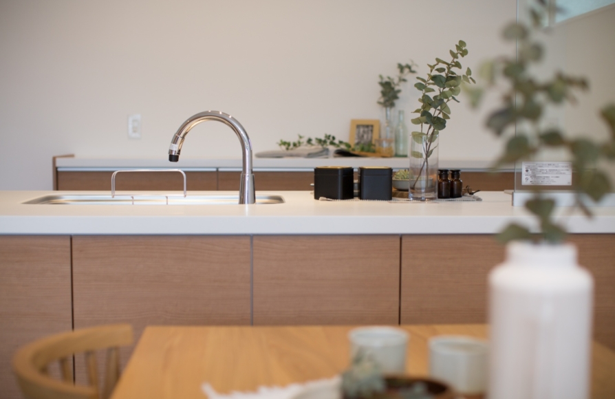吊戸棚や腰壁をなくしたフラットなタイプのペニンシュラキッチンを採用しました。立ち上がりがないので、お手入れがしやすくキレイを保ちやすいキッチンです。ダイニングテーブル側には収納をつけたので、文房具やカトラリー・薬や書類など細かいものを収納することができます。
