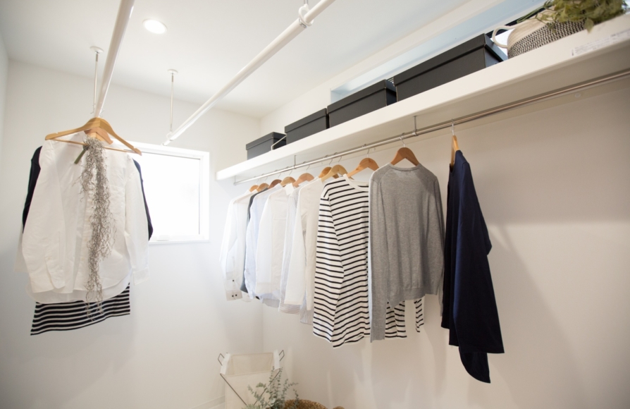 毎日の洗濯は、洗って干して畳んで収納して…。毎日となるとかなり重労働。しかも家族が増えれば増えるほど洗濯の量も多くなりますね。そんな毎日の洗濯が少しでもラクになるように大きなサンルームをつくりました。梅雨時期でも花粉の時期も気にせず洗濯時間も縛られないのが嬉しい。すぐ隣の脱衣室にある洗濯機から出して、ホスクリーンに干す。乾いたらハンガーのままサンルーム内の収納に移動するだけ。南側と西側に窓を設置しているので太陽の日差しを入れながら、風を通すこともできるサンルームです。