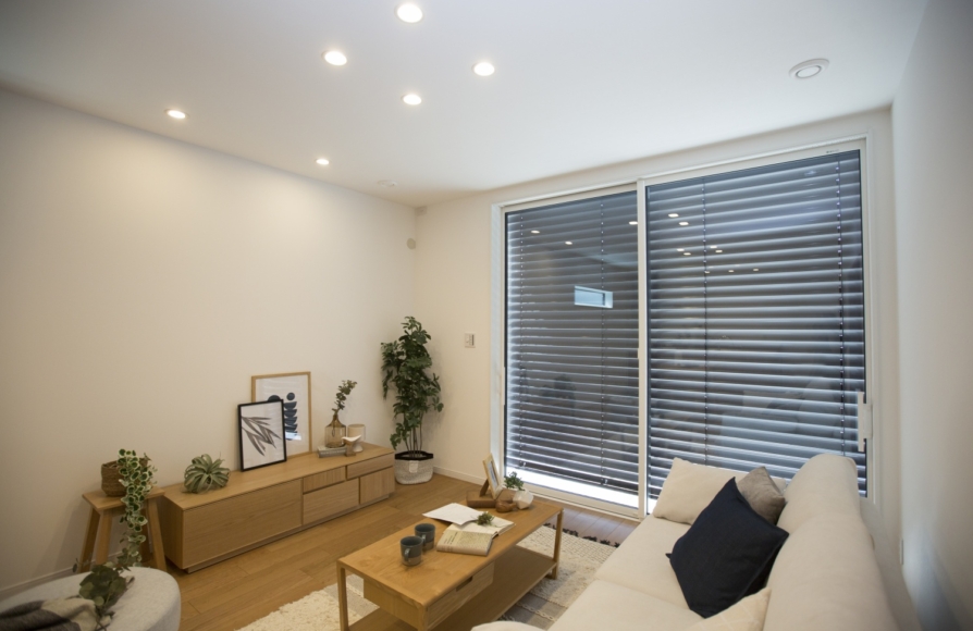 冬はしっかりと太陽の日差しをいれたいですが、夏は日射を入れない工夫をすることでエアコンの効きや、室温が変わってきます。軒や庇を出すことで日差しを遮ることもできますが、正午あたりは少し窓から室内に日差しが入ってきます。その熱を入れないためにヴァレーマという外付けブラインドを設置しました。スイッチ1つで開け閉めが可能でルーバーの角度を変えることもできるので、目線を隠しながらも日射を遮ることができます。