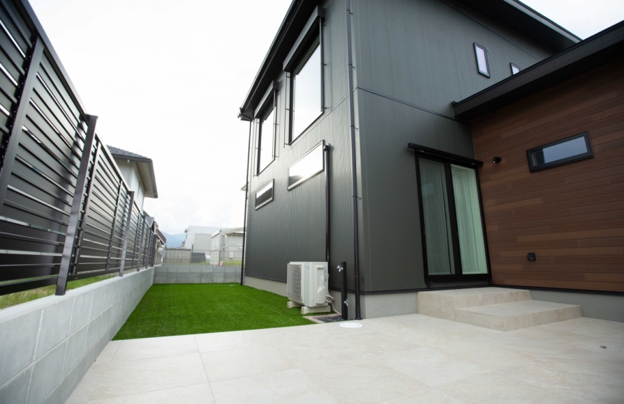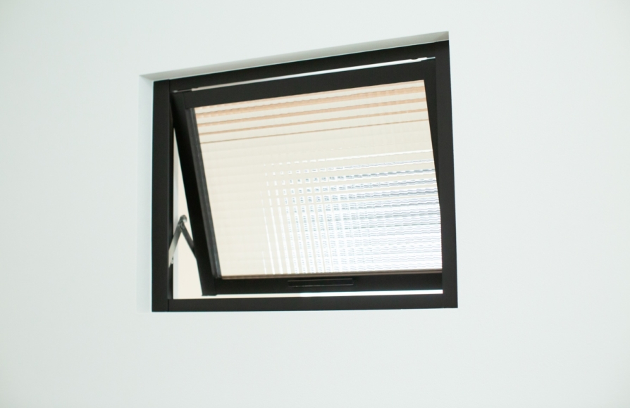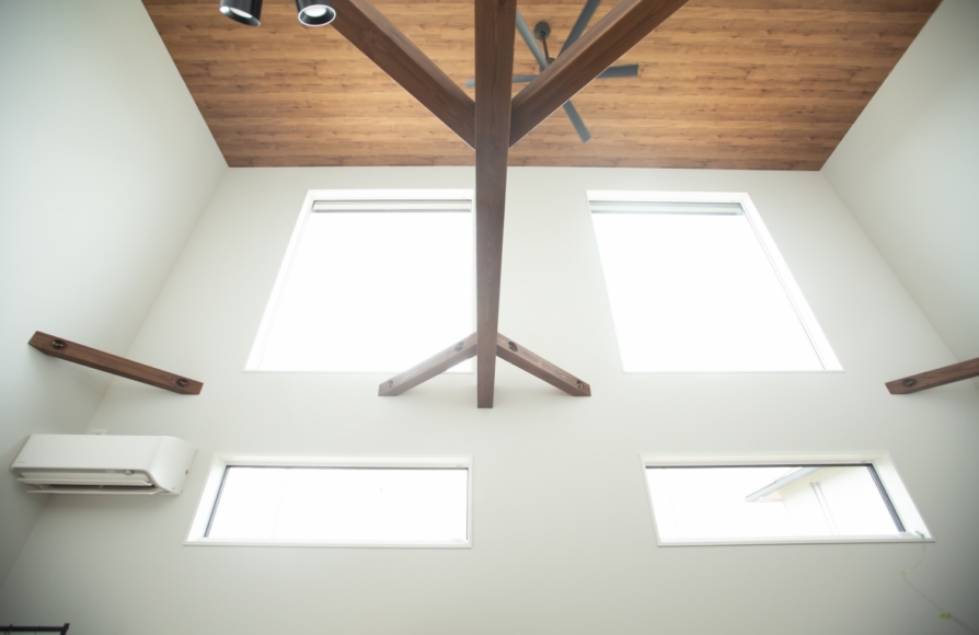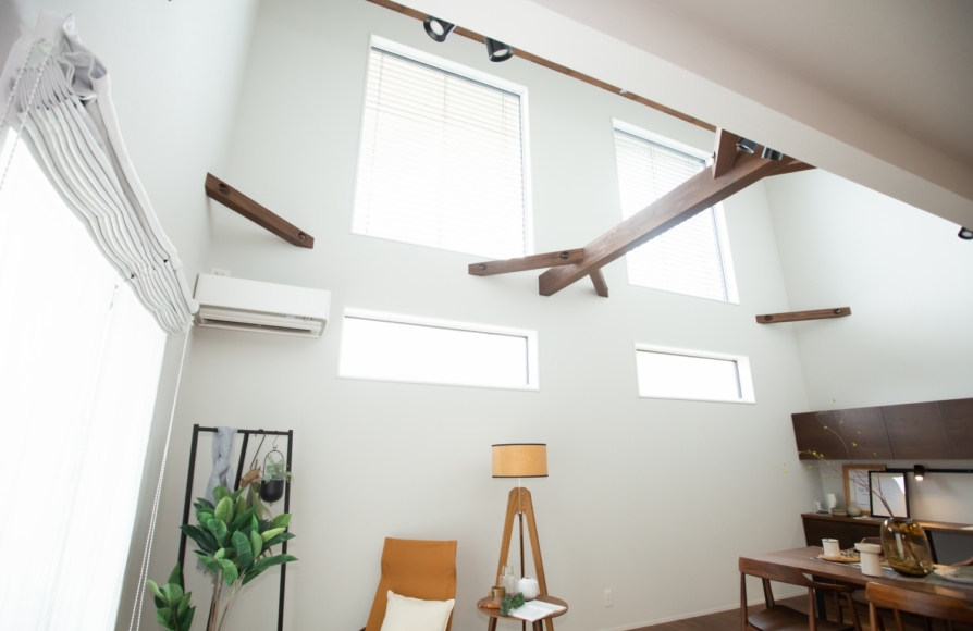 今回の計画地は北側と西側に道路がある北西角地の土地でした。比較的新しい住宅街なので現時点では南側は空き地でしたが、将来的にお家が建つことが十分に予想される土地でした。何十年も住むお家。建築当初は南側が空き地だったから日当たりが良かったけど将来的に2階建てが建って日当たりが悪くなった。ということがないように、2階建てが建つことを想定して日照シミュレーションをしました。そこで1階の窓は高窓にして視線もカットしつつ吹抜け部分に大きな窓をとって日射を取り入れることにしました。冬は吹抜けの大きな窓から光熱費0円の太陽のエネルギーをストーブ代わりにして快適に過ごして頂き、夏は外付けブラインドで、日射を遮ることでエアコンの効きをよくする工夫をしています。