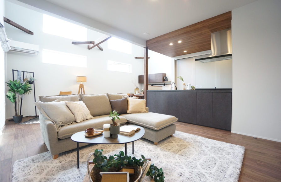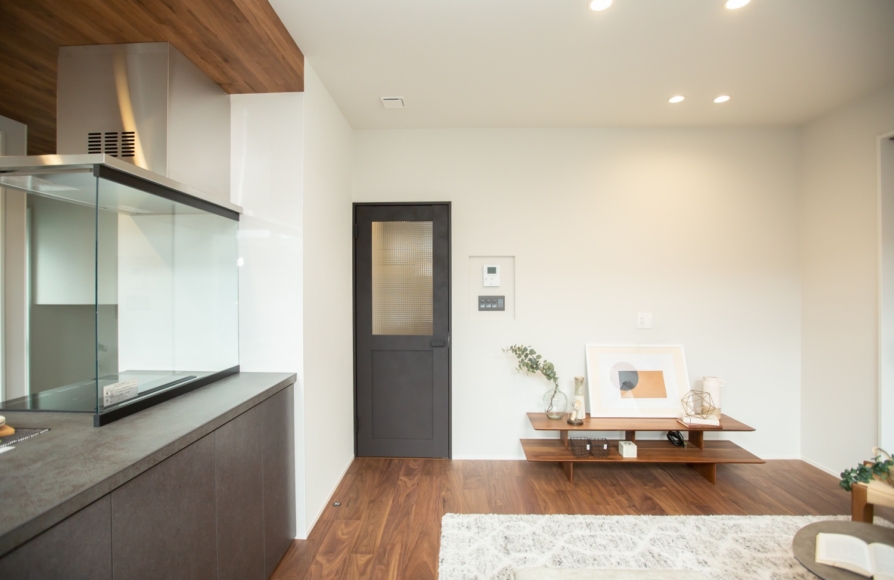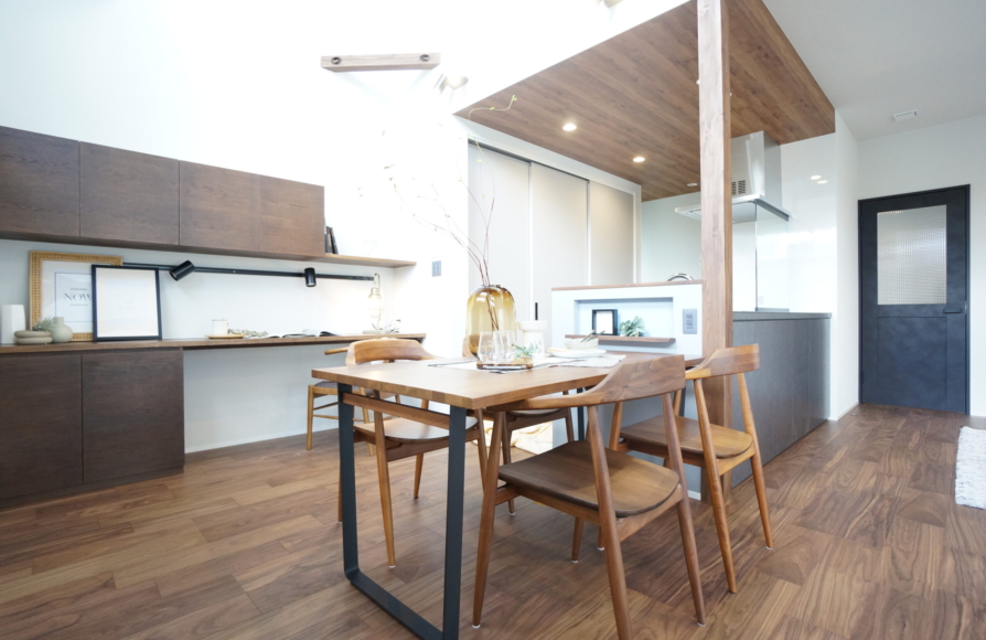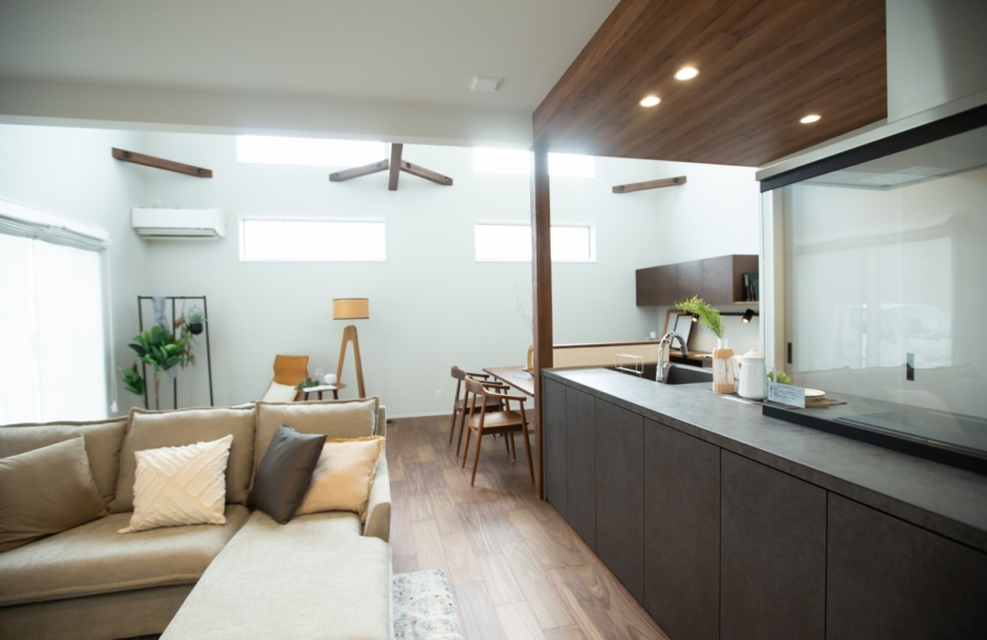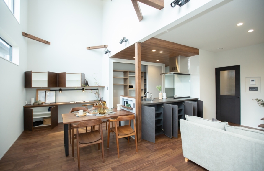 天板がセラミックトップのこだわりのキッチンをLDKの中心にして横並びのダイニングと広々リビングを実現しました。収納は適材適所に配置し、小さなお子様の子育てや仕事で忙しい共働き家族が少しでもスッキリ暮らせるように収納計画にも工夫しています。キッチン裏は全て収納にして、LDKまわりに広がる細々とした日用品や書類関係・お子様のモノなども収納できます。扉を閉めればスッキリ。パパやママがキッチンで作業していても、リビングやダイニングなどお子様の様子をしっかりと見守れるようなゾーニングにしたのも工夫ポイントです。