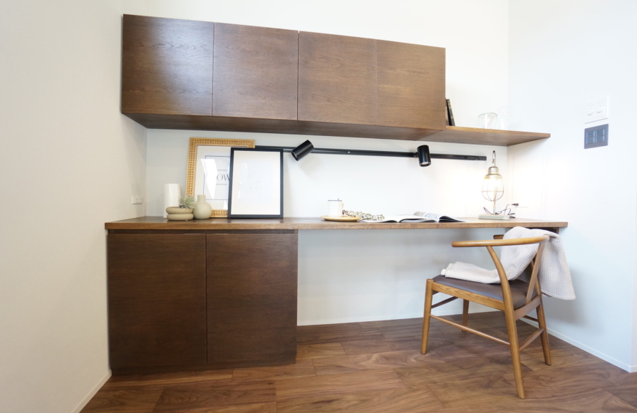 LDKの一角にスタディースペースをつくりました。共働きで忙しいご夫婦なのでお子様が勉強やお絵描きしている姿がキッチンから見えると安心です。スタディースペースのカウンターは文房具や書類など細々したものが多くなったり、カウンターはついつい一時置きをしやすい場所なのでカウンターだけでなく収納扉をつけてしっかり隠せるようにしました。プリンターや書類関係が収納できるように設計しています。造作家具もご提案しているので、使いやすい高さや大きさで収納やカウンターをつくることができます。