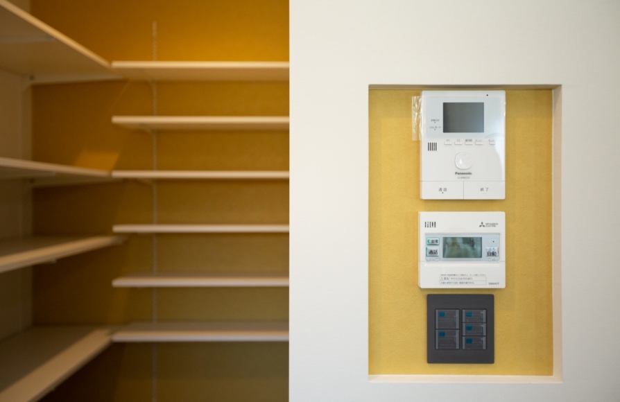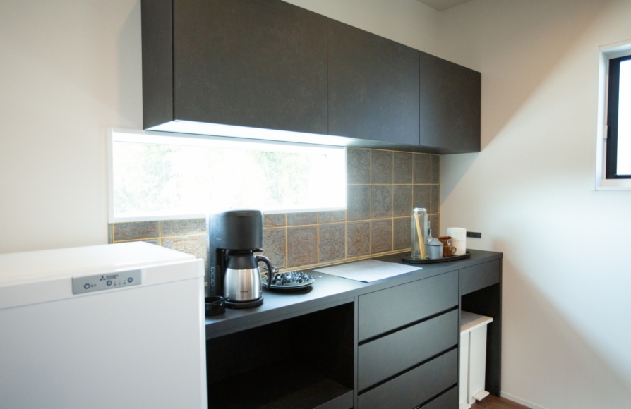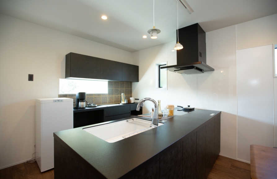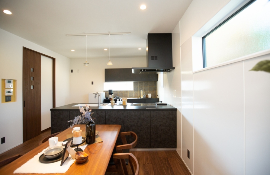 キッチンダイニングは人だけの空間として、あえてリビングから独立させました。冷蔵庫だけではなく、冷凍庫も置くスペースを確保。共働きでまとめ買いやつくり置きをするニーズに対応しています。窓の下の壁は一面ホワイトボードを施工しました。家族間でメッセージを書いたり、予定を貼ったり、小さなお子様がお絵描きをしたり楽しく使って頂けそうです。キッチンはこだわりのパナソニックのLクラスを採用。3口が横並びになっているIHコンロが特徴で、ブラックでまとめた高級感のあるキッチンになっています。カップボードは造作でつくりましたが同じブラックでまとめています。 こだわって選んだタイルや照明など、毎日家事を頑張る場所だからこそお気に入りのモノに囲まれた空間になっています。