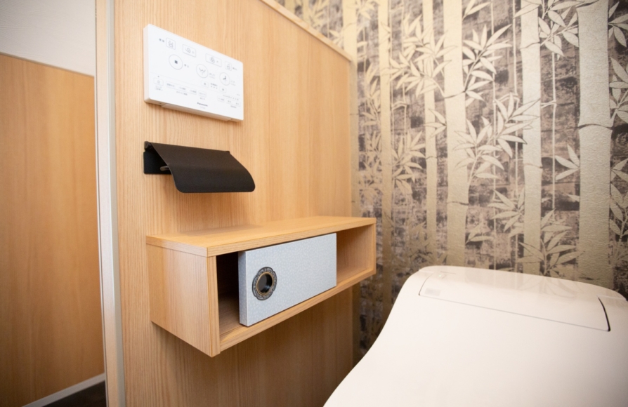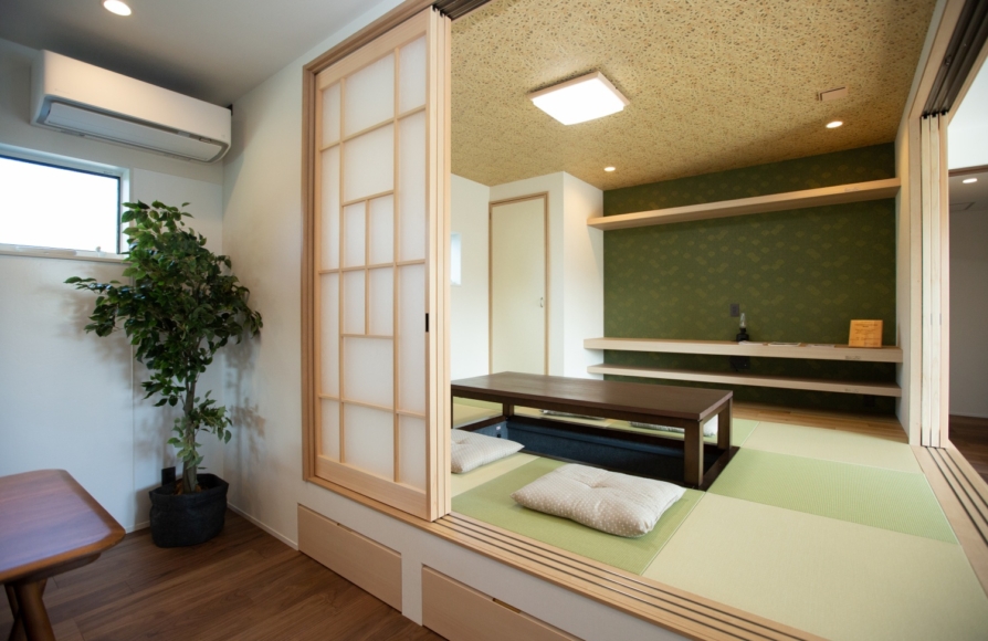 リビングやキッチンダイニングと繋げたり仕切ったりできる空間として、床上げ和室をつくりました。この空間もこだわりがぎゅっと詰まっていて、床上げ部分には引出し収納をつくって収納力をアップさせています。掘りごたつも採用。使わないときにはテーブルごと床の下に収納できる優れものです。来客があるときもここの和室に泊まって頂くような設計にしています。 和室を仕切っている扉も、紙の障子ではなくアクリルを使って1からデザインして制作しました。
