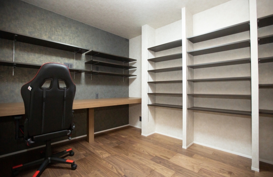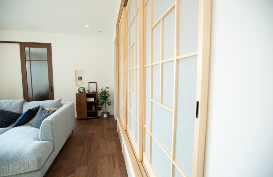 造作建具を閉めたところです・天井や壁などこだわり抜いたアクセントクロスがとっても良い感じです。掘りごたつに座って造作でつくりつけているカウンターにテレビを置いてくつろげる空間になっています。