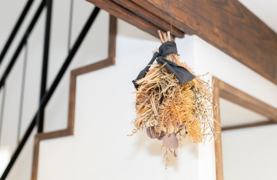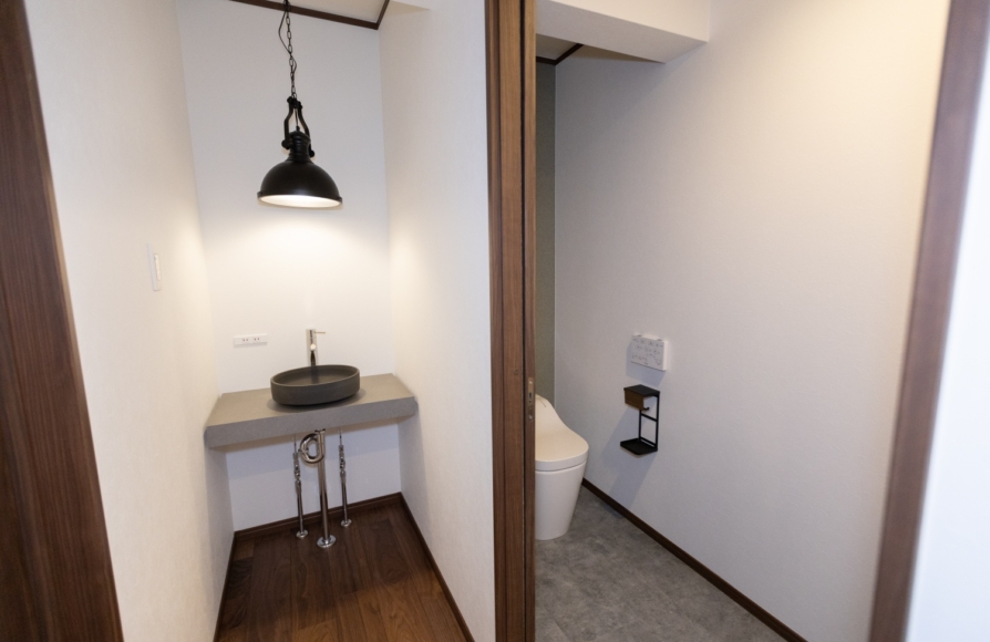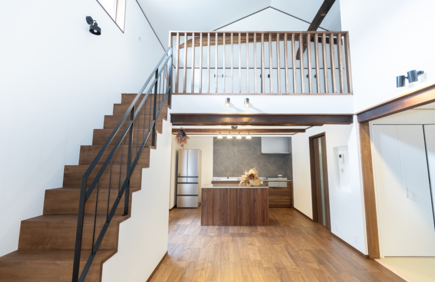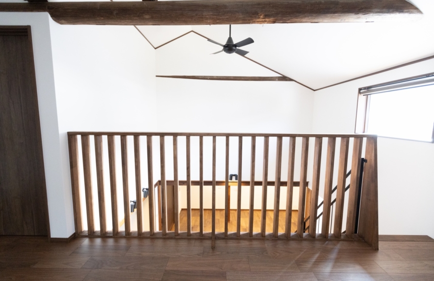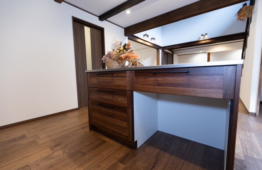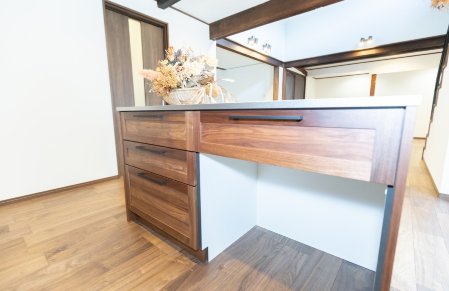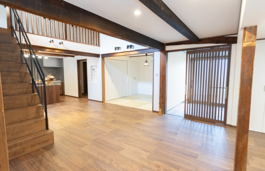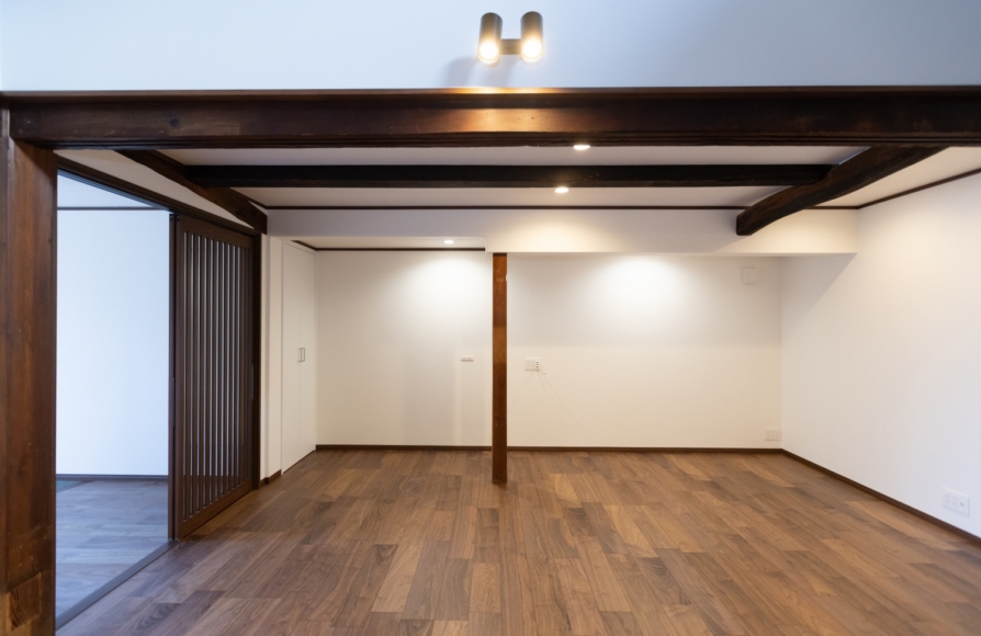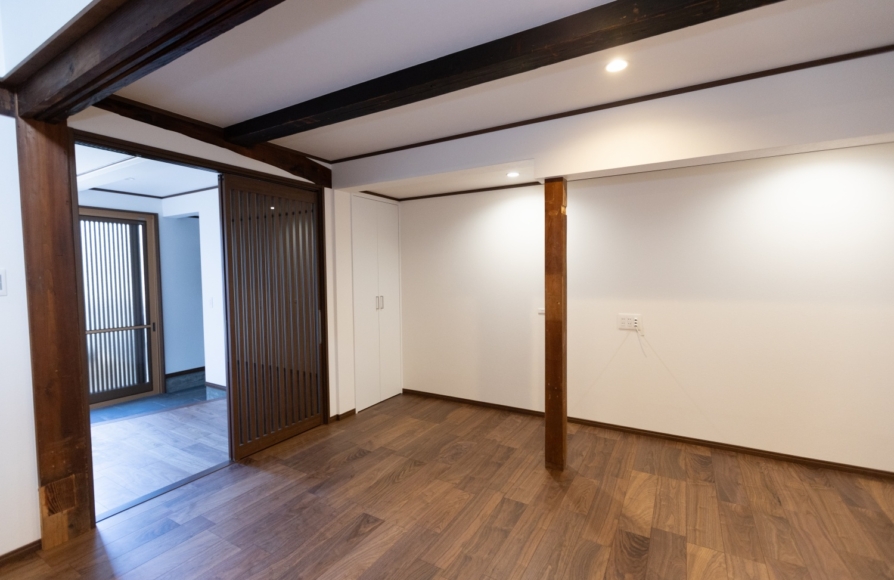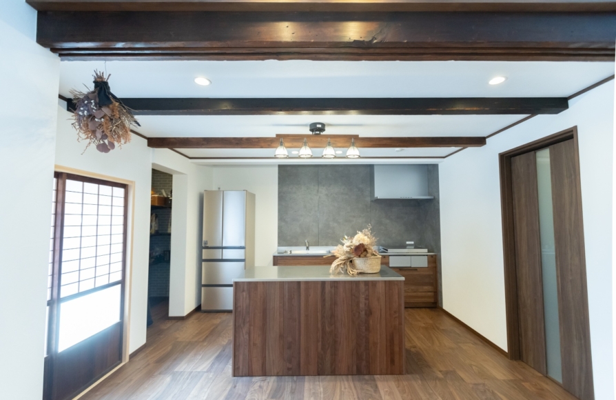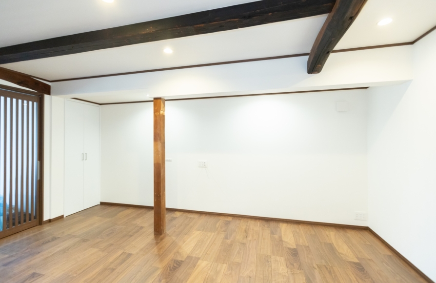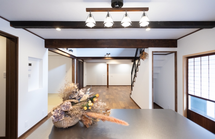 古民家ならではの柱や梁はできるだけそのままの形で残しながら、新しいモノとどう融合させていくか、古民家らしさを残せるかにこだわって計画しました。 ウォルナット色の梁や床材が映えるように、クロスはホワイトで統一しました。