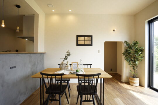手元を隠せるキッチン腰壁をマイクロセメントMPC仕上げにしました。左官仕上げ特有の質感がとても素敵に仕上がっています。 おこもり空間にいくアーチ壁は、高さや形状にこだわってお施主様と相談しながら決めていきました。隣の室内窓と並んでとても可愛いです。