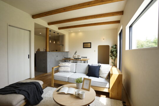アカシアの床材に色味をあわせた見せ梁が印象的なLDK空間です。リビングとつながる3帖のわんちゃん部屋も確保しました。床材はお手入れしやすいフロアタイルを採用して、わんちゃんグッズを収納する棚や見守りカメラを置けるようにコンセントの位置などもしっかり計画しました。断熱性能や気密性能をしっかりと高めることで、小さな冷暖房エネルギーで人もワンちゃんも快適に暮らせる空間になりました。