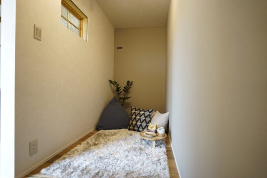 可愛いアーチをくぐり抜けたリビングの一角に、自分だけのくつろげるおこもり空間ができました。 プロジェクターを使って映画鑑賞をしたり、まったり自分だけの時間を過ごしたり。 あえて天井を下げることで、おこもり感のある居心地の良いお部屋になりました。
