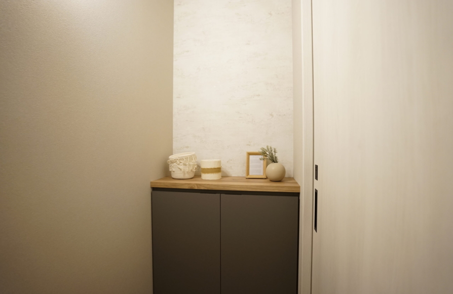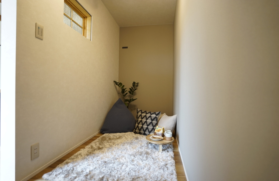 可愛いアーチをくぐり抜けたリビングの一角に、自分だけのくつろげるおこもり空間ができました。 プロジェクターを使って映画鑑賞をしたり、まったり自分だけの時間を過ごしたり。 あえて天井を下げることで、おこもり感のある居心地の良いお部屋になりました。