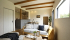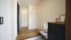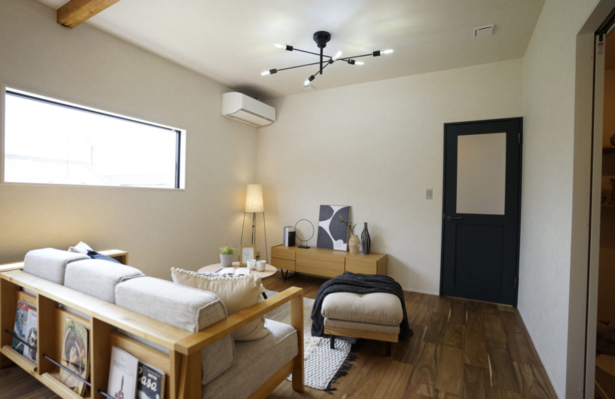 アカシアの床材に色味をあわせた見せ梁が印象的なLDK空間です。リビングとつながる3帖のわんちゃん部屋も確保しました。床材はお手入れしやすいフロアタイルを採用して、わんちゃんグッズを収納する棚や見守りカメラを置けるようにコンセントの位置などもしっかり計画しました。断熱性能や気密性能をしっかりと高めることで、小さな冷暖房エネルギーで人もワンちゃんも快適に暮らせる空間になりました。