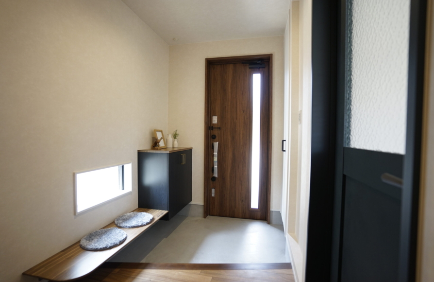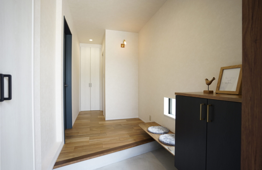 玄関框を斜めにすることで、空間を広く見せつつ使い勝手の良い玄関にしました。可愛い色合いの玄関収納の横にベンチをつくって明るさやデザイン的にも可愛いFIX窓を設置しました。 玄関を入って正面の壁に、お施主様こだわりの真鍮のブラケットライトを採用しました。玄関収納の取手もさりげなく真鍮で揃えています。 一つ一つ丁寧に選び抜いた、こだわりアイテムが満載の玄関空間です。