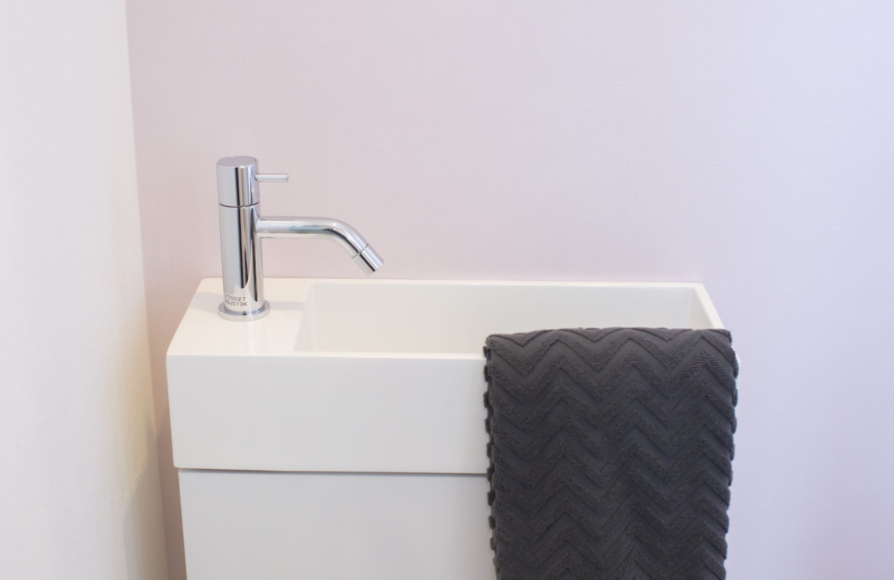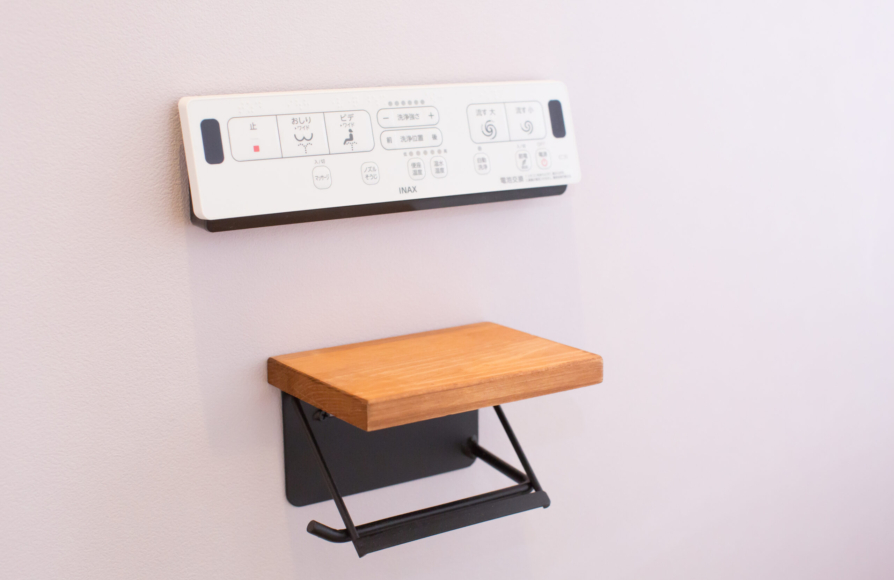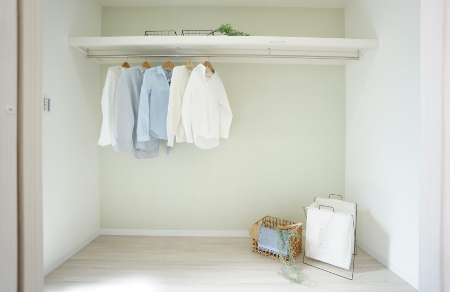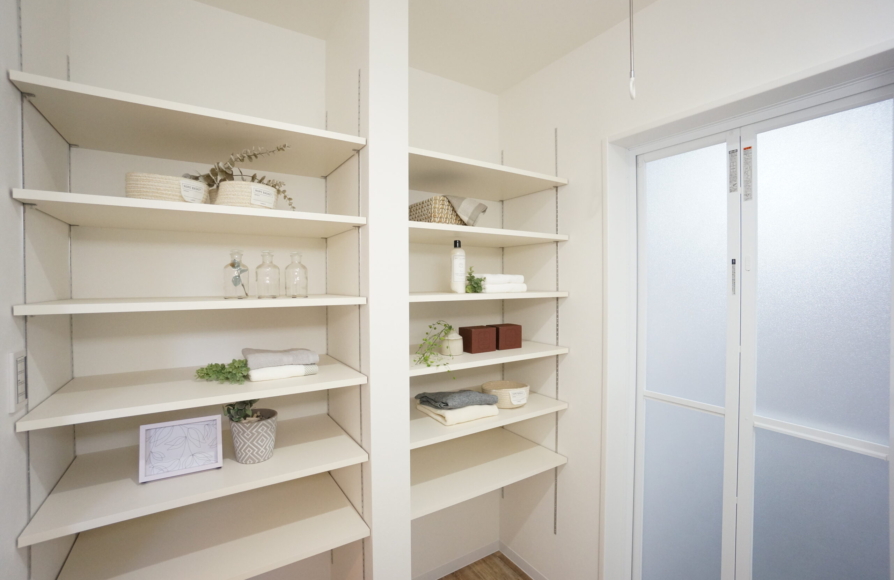 脱衣洗面スペースは、タオルだけでなく洗剤のストック・下着類やパジャマ・脱衣カゴに体重計など意外と収納量が多い場所になります。奥行45cmの可動棚を設置することで日用品や収納カゴがしっかりとおさまります!使用済のバスタオルを干しておけるように、脱衣洗面にもホスクリーンを設置しました。