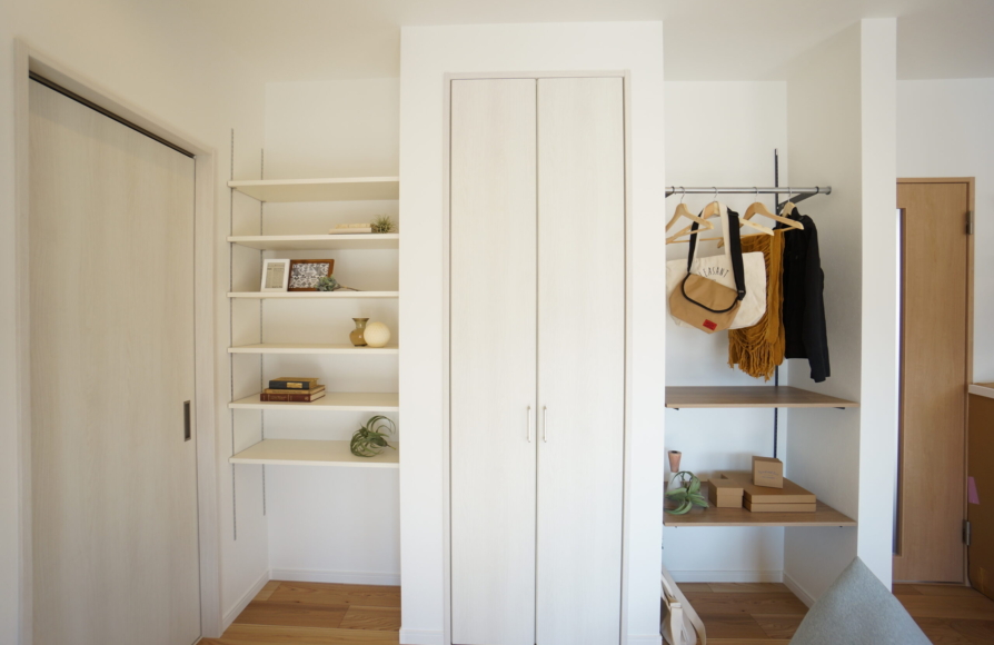 リビングのドアを入ってすぐの収納スペースはアウターやカバン置場の定位置に。ハンガーパイプや棚の高さを変えることができるので、お子様の成長にあわせてちょうどよい高さに設定することができます。保育園のお子様たちも帰ったきたらここにカバンを置いてくれるそうです!子供たちが自分で収納できる工夫をしておくとパパやママはとってもラクになりますね!