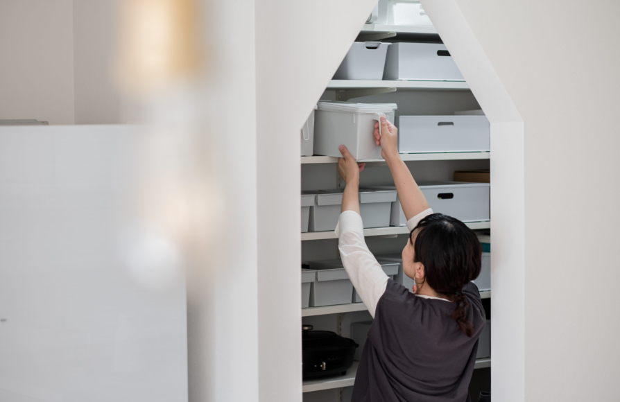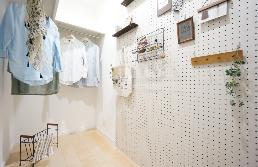 ランドリールームの隣にあるファミリークローゼット。毎日家族が着る衣類を1ヵ所にまとめることで「収納する」までの洗濯の時間がとにかく楽になります。ファミリークローゼットを1階につくることで、LDKに散乱しがちなカバンやアウター類・帽子などを家族みんながきちんとクローゼットにしまいやすくなるのです。さらに、この家ではファミリークローゼットの壁の一面を有孔ボードにしたことで、帽子やカバンもフックにかけて収納できるのが便利なポイント。散らかりにくいお家にするための収納計画が、毎日の掃除を楽にしてくれるでしょう。