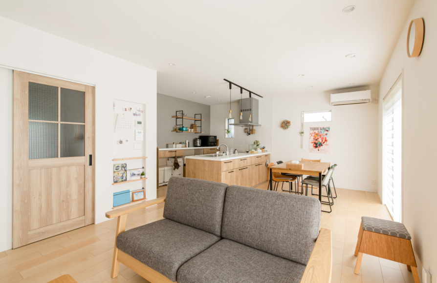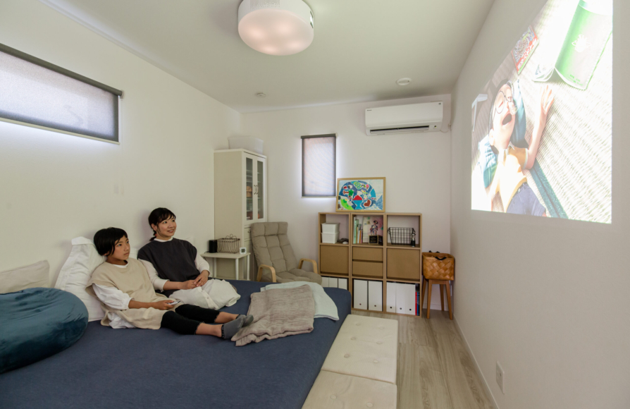 リビングと繋がる扉の向こうは6帖の洋室に。今は小学生のお子様のデスクやピアノのお部屋として使われていますが、将来ご夫婦が1階だけで生活したくなった時に寝室として使えるように設計しました。ファミリークローゼットやランドリールーム・水廻り設備を全て1階にまとめることで、将来平屋として快適にお住まい頂ける間取りになっています。